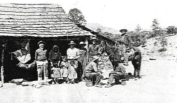 Left to Right: Trinidad Marquez, Senora Estrada, children, John Haley, Florencio Estrada, Andres Villa, Van Lee (on horse) Clarence Lunt and Florencio Estrada.